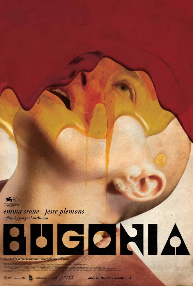 Must komöödia "Bugonia" on uusim värvikas kinokogemus, mille lavastajaks originaalseid lugusid armastav Yorgos Lanthimos ("Vaesekesed", "Soosik", "Püha hirve tapmine"). Osades 2-kordne Oscari-võitja Emma Stone ("La La Land", "Vaesekesed"), Jesse Plemons ("Kodusõda", "Lugusid headusest"), Alicia Silverstone ("Clueless", "Püha hirve tapmine"), uustulnuk Aidan Delbis ja paljud teised. Stsenaariumi kirjutas Will Tracy ("Menüü", HBO seriaal "Succession").