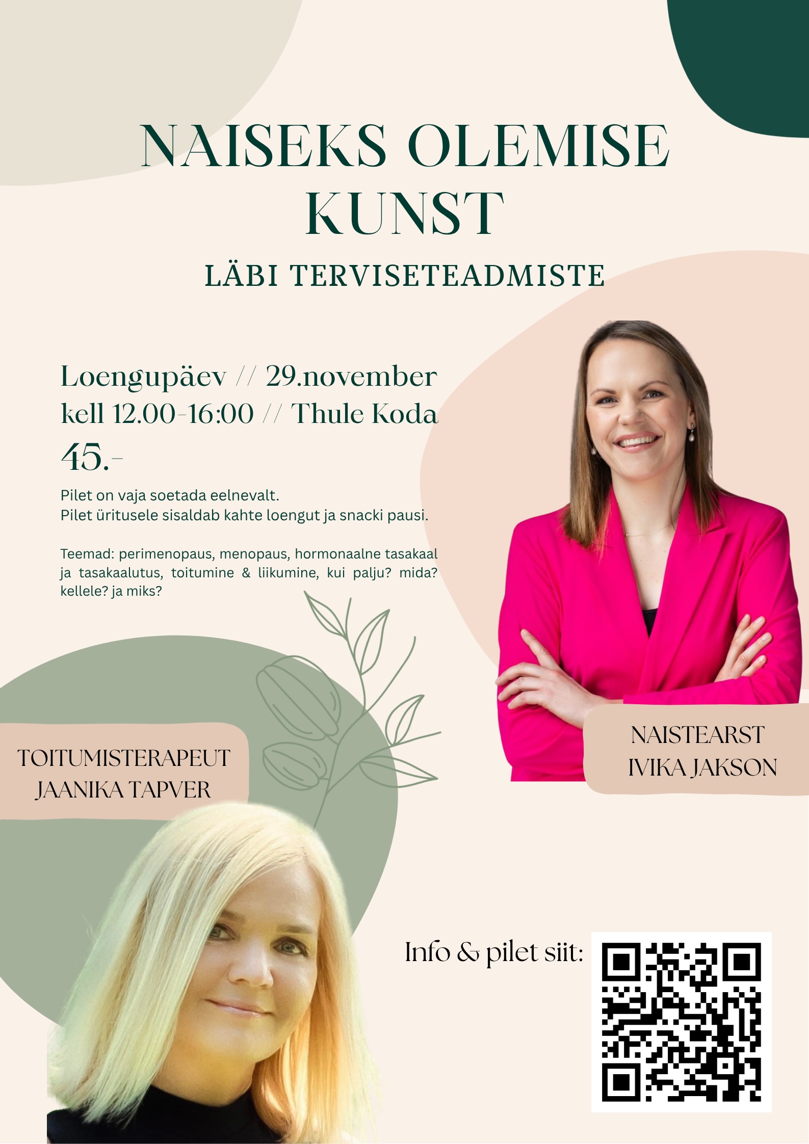 Naistearst Ivika Jakson räägib, mis toimub Naise kehaga menopausi eelselt ehk perimenopausi perioodil (naised vanuses 35a+.) selle ajal & järgselt (postmenopaus). Kuidas end ettevalmistada, aidata & toetada.