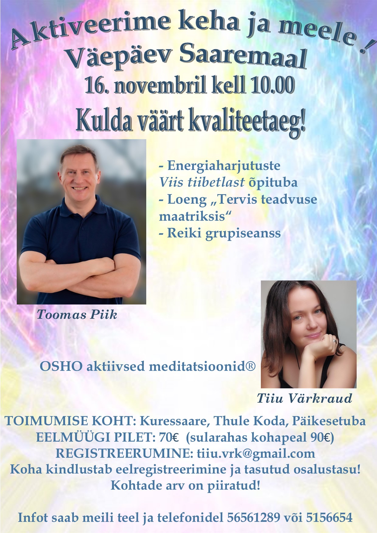 Pühendame päeva heaolule- keha – meele koostoimimisele ja meditatsioonile, mis on suurepärane vahend, toomaks meid lähemale iseendale. Häälestame oma meeled ja lubame meditatsioonil, praktikatel ja loengutel rõõmsama endani jõuda. Selle ruumi loovad Sulle energeetiline tervendaja, Reiki Meister Toomas Piik ja meditatsiooni õpetajana Eesti Meditatsiooni Kooli detsembris lõpetav Tiiu Värkraud, kes on juba omandanud rahvusvahelise sertifikaadi, mis annab õiguse jagada OSHO aktiivseid meditatsioone® ka teistega.
